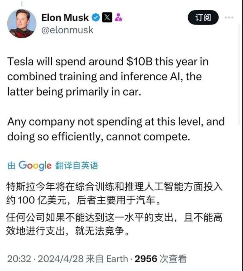 但端到端对自动驾驶来说,可能是 「有效解法」,但却不一定是 「最佳解法」。马斯克曾发文表示,特斯拉今年将在综合训练和推理人工智能方面 (主要用于汽车) 投入约 100 亿美元,任何公司如果不能达到这一水平的支出,且不能高效地进行支出,就无法竞争。