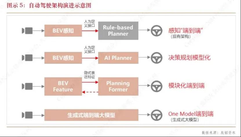 据辰韬资本研报显示,自动驾驶架构的演进可以分为四个阶段,分别是感知端到端;决策规划模型化;模块化端到端;单一模型端到端。