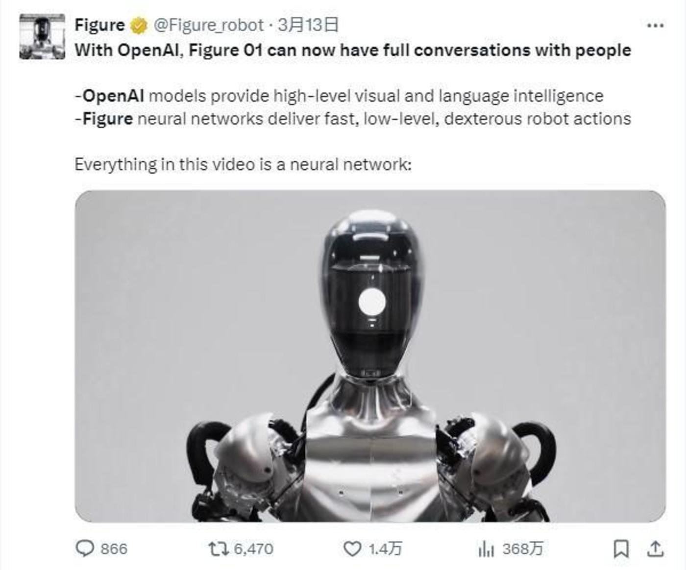 这意味着 Figure 01 实现了感知、决策和执行一体化的端到端处理,通过在上层