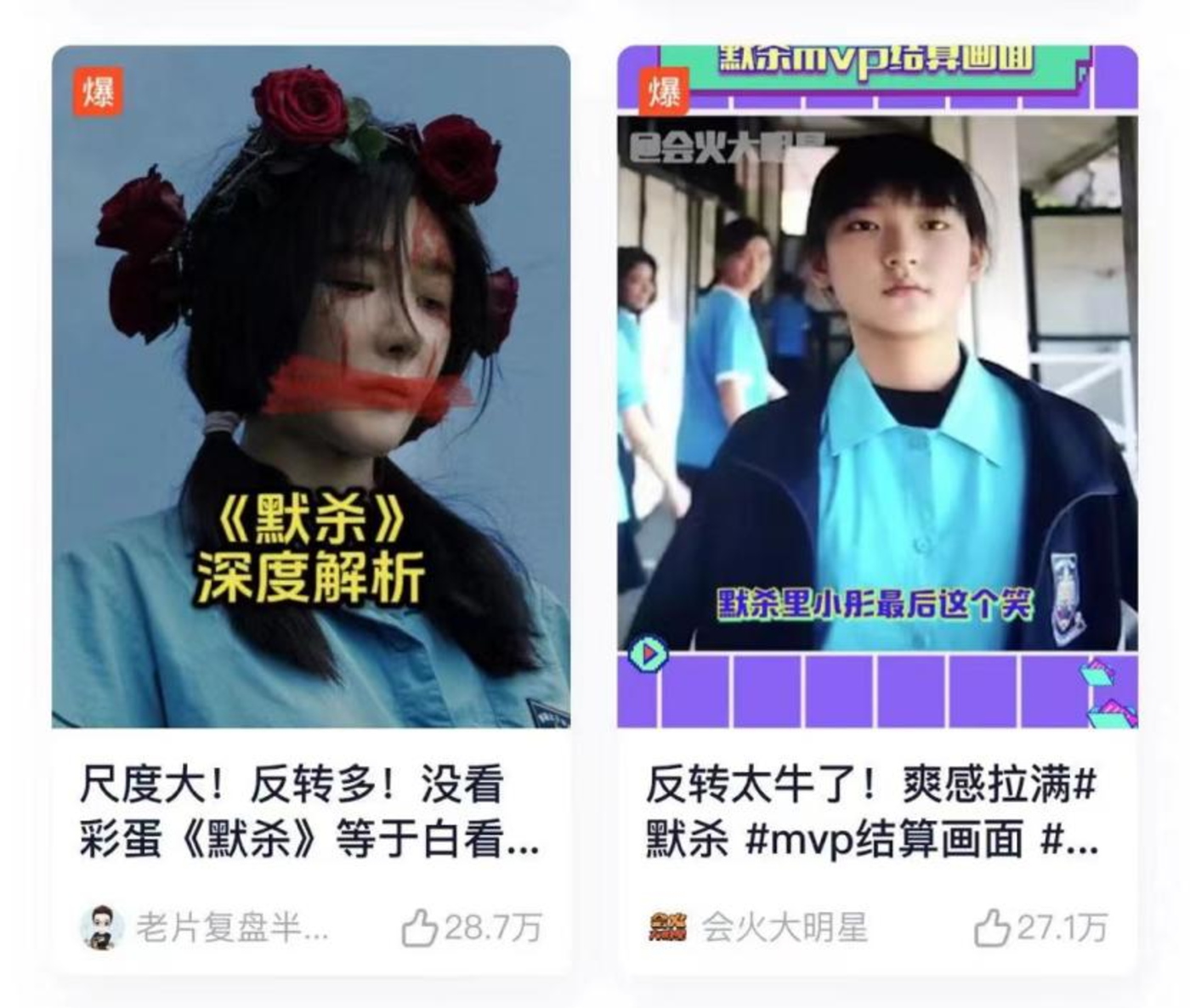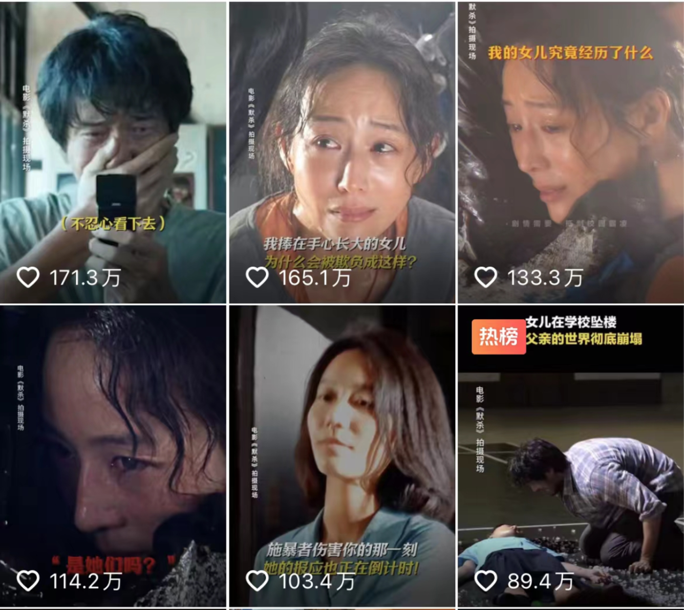《默杀》 找到了这个点。在 《默杀》 的官方抖音账号数据最好的前五条视频里,有四条都是影片开篇女孩被霸凌用胶水粘在墙上的段落。虽然这些片段的过度泛滥,也已经招致不少网友批评,但从效果而言,的确吸引到了不少观众对它的注意。
