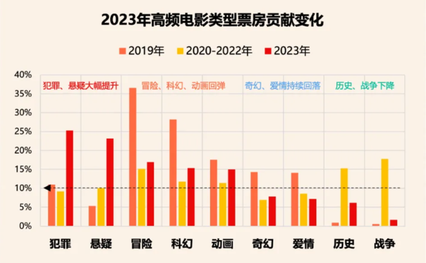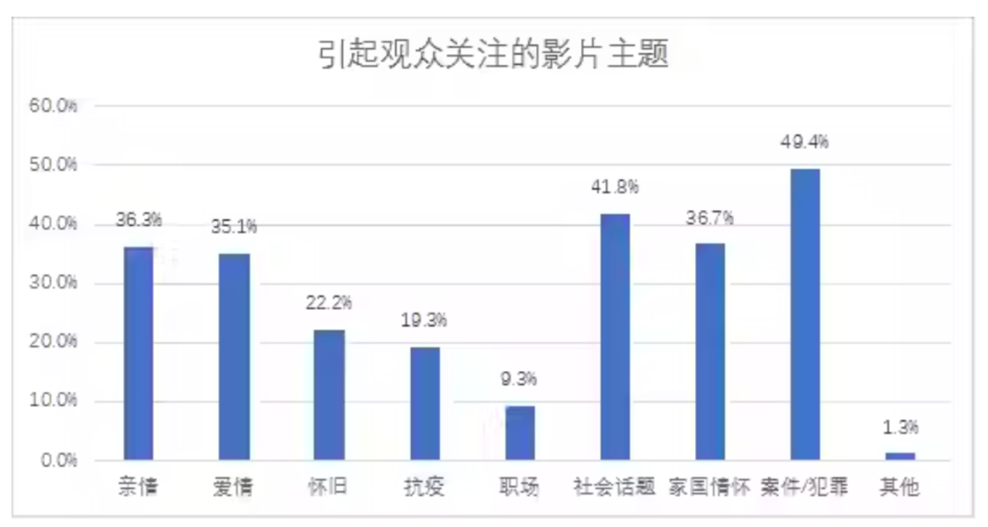 早在中国电影报发布的 2021 年 《中国电影观众调查报告》 中就曾显示,观众最感兴趣的是案件/犯罪题材的影片,占比 49.4%,但 2021 年公映的犯罪类型影片数量仅占全年总量的 3%,处于严重的供需不平衡状态中。但市场的需求还是传导到了从业者的眼中,这或许是 2023 年悬疑犯罪电影迎来井喷的原因之一。