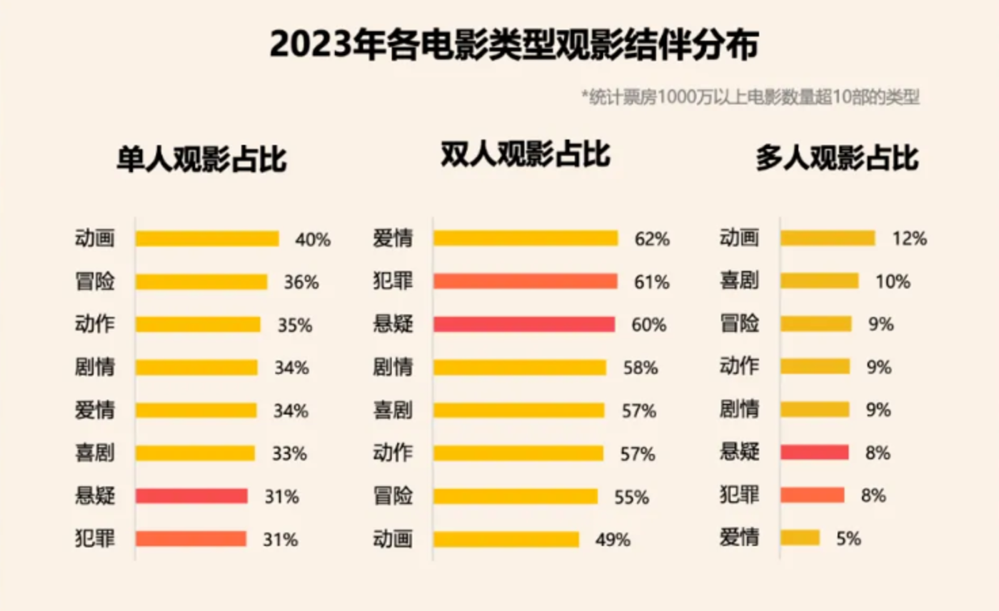 在悬疑犯罪片中,工具价值是什么呢?一则非常有趣的数据是,在 2023 年各电影类型观影结伴分布中,悬疑犯罪片在单人和多人观影占比中均处于低位,只有在双人观影占比中排名前列。
