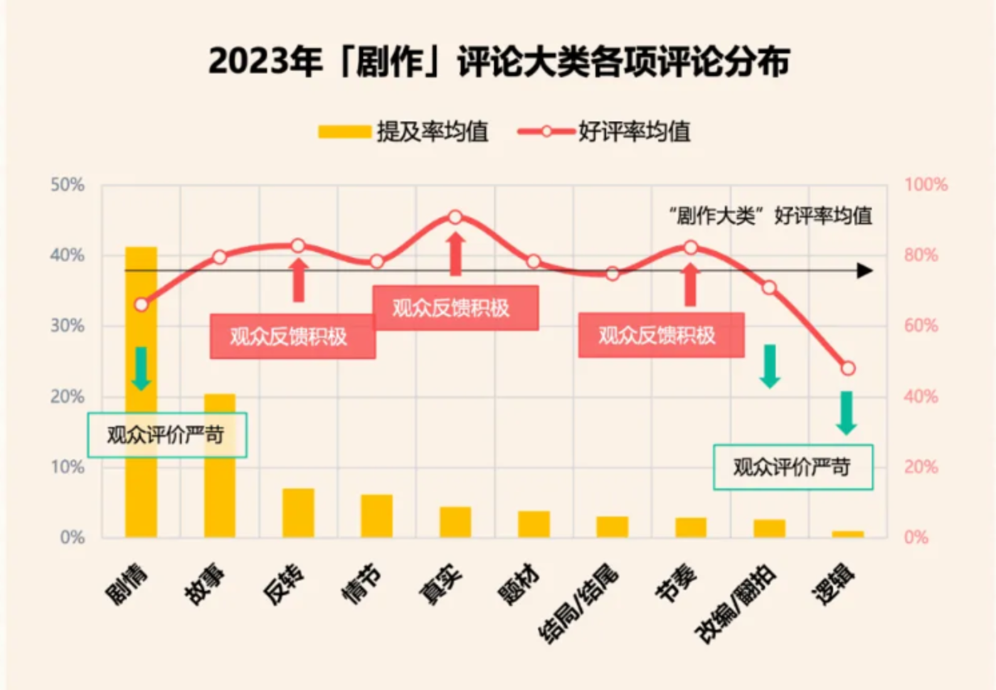 首先是逻辑,中国观众尤其在意电影的逻辑,某种程度上这也是悬疑犯罪电影受欢迎的原因之一。报告显示,2023 年关于 「剧作」 的评论中,观众对于逻辑方面的评价最为严苛,也是好评率最低的一个维度。换言之,只要一部悬疑犯罪片,在逻辑上做到很难被挑出错,那么它就能在普通观众中拥有相当不错的 「口碑」。