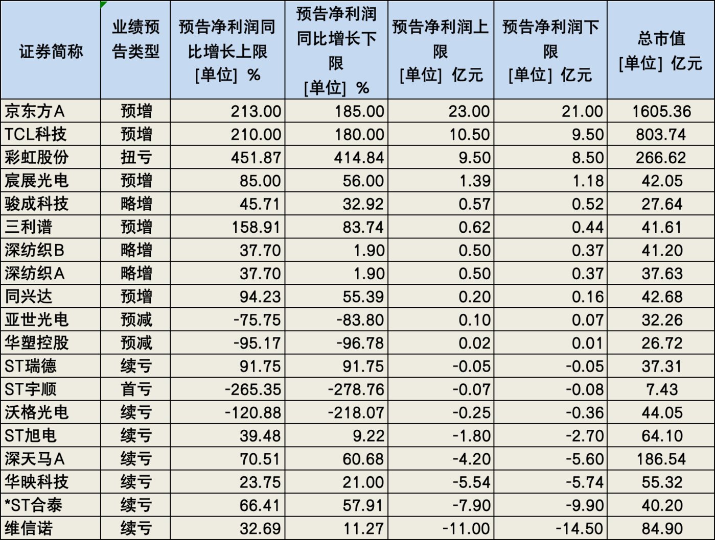 周天财经 APP 梳理发现,截至发稿,面板行业有 19 家上市公司披露业绩预告,其中有 9 家业绩预喜、2 家业绩预减、8 家呈亏损状态。净利润规模排名前五的分别为京东方 A、TCL 科技、彩虹股份、宸展光电和骏成科技,今年上半年预计分别至少实现净利润 21.00 亿元、9.50 亿元、8.50 亿元、1.18 亿元和 0.52 亿元。
