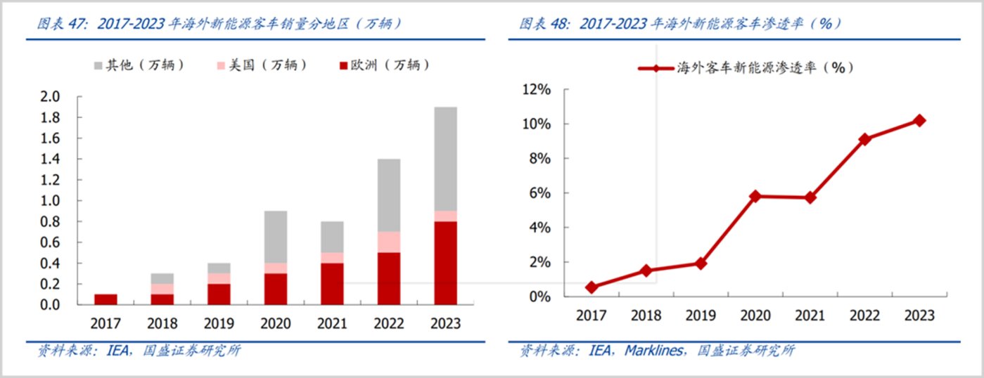 目前,海外新能源客车市场仍是一片蓝海。据国盛证券统计,海外新能源客车销量从 2017 年的 0.1 万辆提升至 2023 年的 1.9 万辆,期间复合增速约 63%。渗透率由不足 2% 快速提升至 2023 年的 10% 以上,未来提升空间仍然较大。