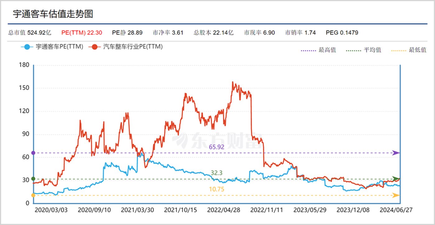截至 7 月 12 日,宇通客车的动态估值为 22.3 倍,虽然近年来股价出现了幅度不小的上涨,但估值相对于板块和公司过往仍不算高。