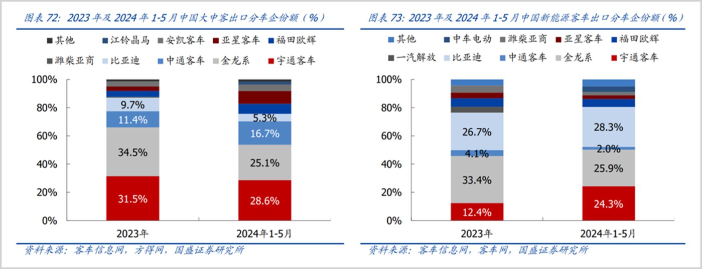 此外,据券商研究,2024 年前 5 月宇通累计出口了 4921 辆客车,其中出口新能源客车 941 辆,同比大增了 96%,出口份额占比达 24%,预计未来仍将提升。