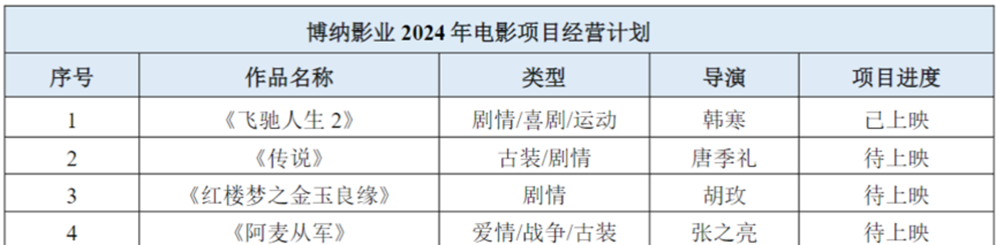 2024 年上半年,博纳影业参与投资或发行的影片包括 《飞驰人生 2》《挑战》 和 《狗阵》,不仅数量极少,《飞驰人生 2》 还是唯一大卖的影片,博纳影业不出意料在上半年继续亏损。