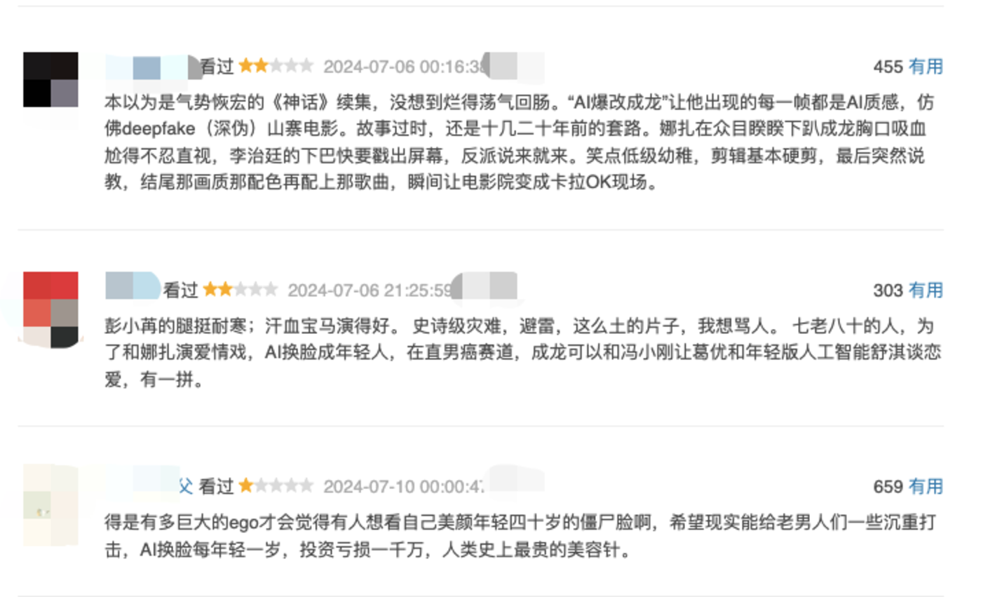 但实际效果落差巨大,档期操作和宣发都难以改变 《传说》 不被观众看好的现实。翻看豆瓣短评,不乏大量言辞激烈的差评:「本以为是气势恢宏的 《神话》 续集,没想到烂得荡气回肠。「AI 爆改成龙」 让他出现的每一帧都是 AI 质感」、「是可以加入富春山居图、封神传奇等大制作烂片豪华套餐的雷人程度」……