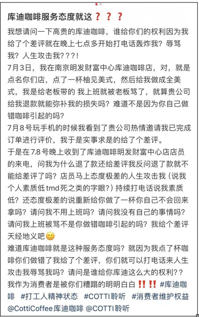 换豆子的吐槽声还没完,近日又有消费者在小红书吐槽,库迪店员做错了产品,退款解决后给了差评,却被门店电话轰炸,甚至进行人身攻击。