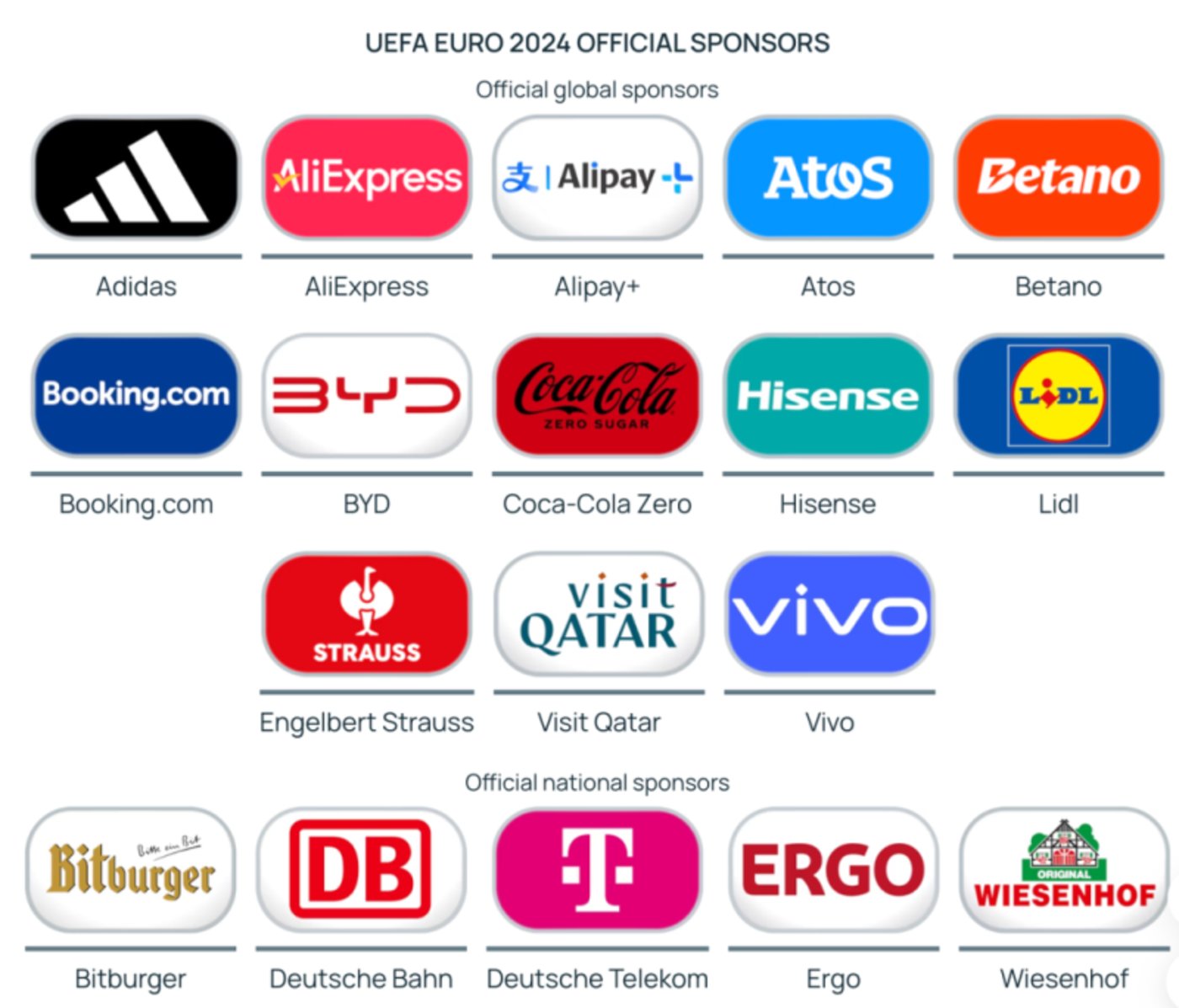本届欧洲杯,共有 13 家官方全球赞助商,其中有 5 家来自中国,包括支付宝、速卖通、比亚迪、海信和 vivo,从赞助商数量上来看,中国品牌甚至超过了美国与德国本地的总和 (美国 2 家:可口可乐、联合利华,德国 2 家:Lidl、Engelbert Strauss)