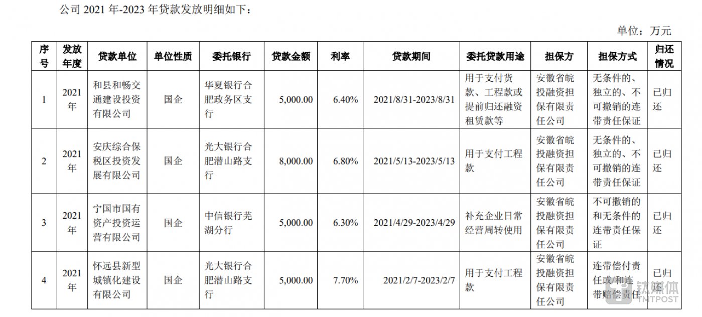 与此同时,公司还涉及了放贷业务。公告显示,2021 年至今,公司发放 7 笔共 4.46 亿元委托贷款,借款人均为国有企业,贷款利率均高于同期银行存贷款基准利率水平,其中,公司对怀远县新型城镇建设有限公司的贷款利率达到了 7.7%。