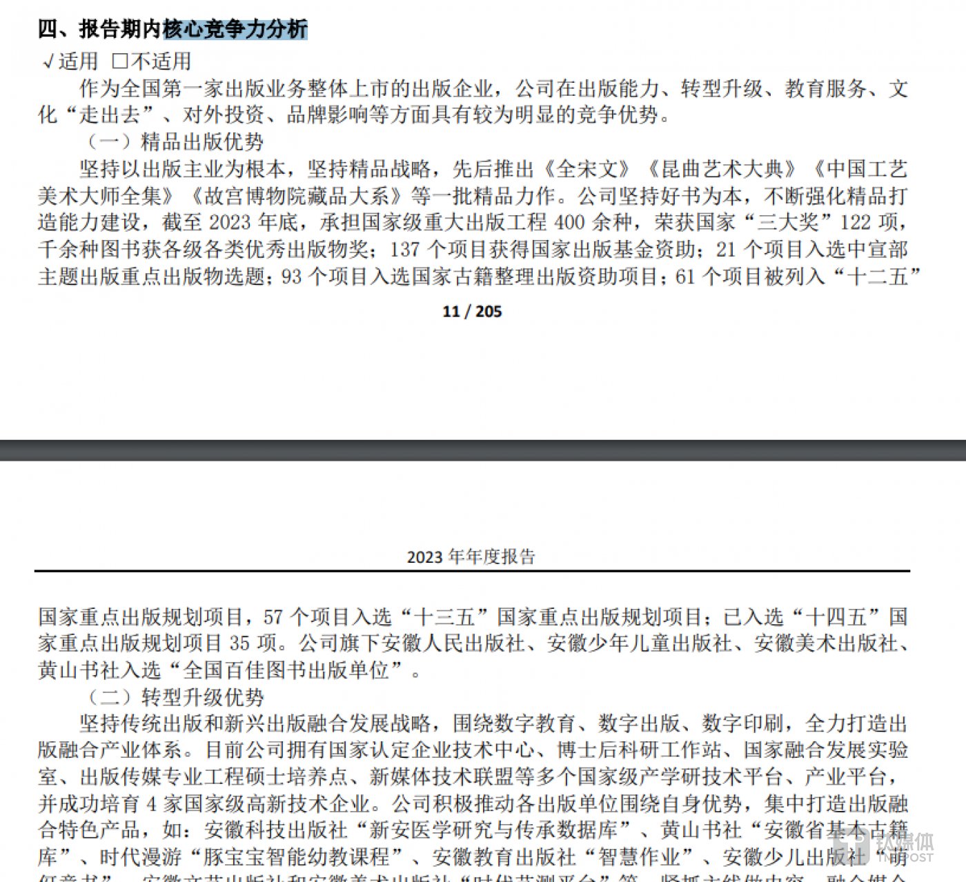 2023 年,公司实现营业收入 86.43 亿元,同比增长 13.03%,净利润达到 5.55 亿元,同比增长 61.21%,除去改制文化企业税收优惠政策变化等非经常性因素,时代出版净利润为 3.47 亿元,同比增长 21.9%。公司主要经营指标实现了两位数的增长,并首次入选 「全国文化企业 30 强」。