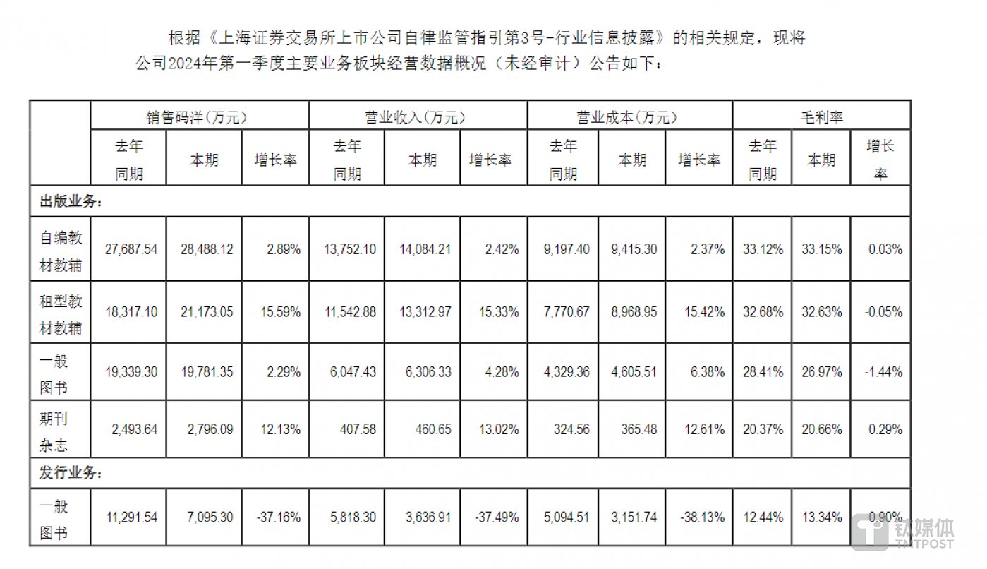 和常规认知不同,时代出版的绝大部分营收依靠印刷物资及文化商品贸易。2021 年—2023 年,公司贸易业务收入分别为 51.88 亿元、48.63 亿元、56.43 亿元,分别占比 65.73%、63.61%、65.29%。但蹊跷的是,对于占比如此之大的业务,公司在各报告期的经营数据中却未单独列出,以今年一季度为例,公司也只列出了其出版业务和发行业务的经营数据。