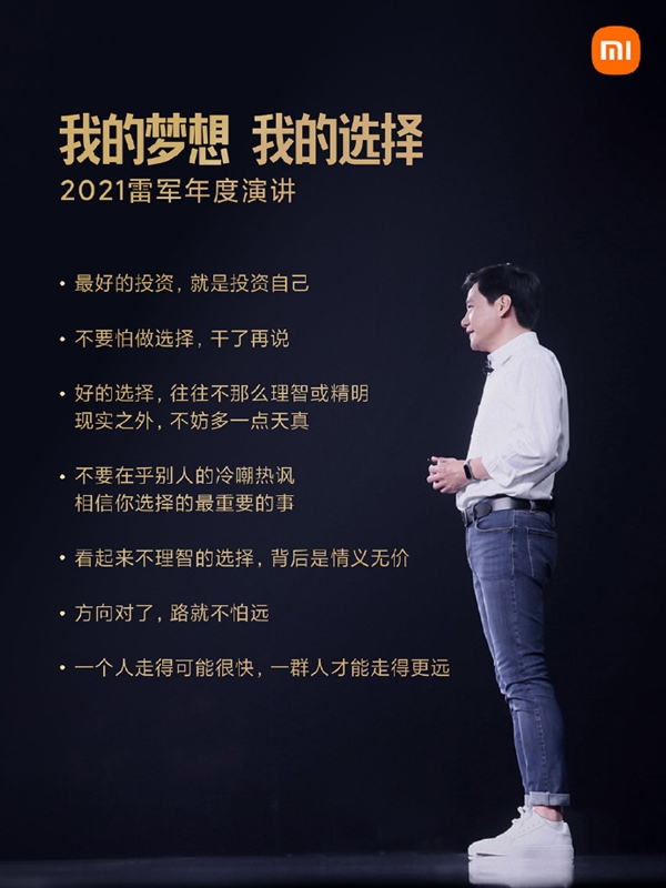 2021 年 8 月 10 日,雷军发表 「我的梦想,我的选择」 年度演讲,首次揭秘自己最艰难的 10 个选择,涉及上市破发、股票回购、高端之路,以及小米平板、小米电视、CyberDog 仿生四足机器人等产品的选择等。