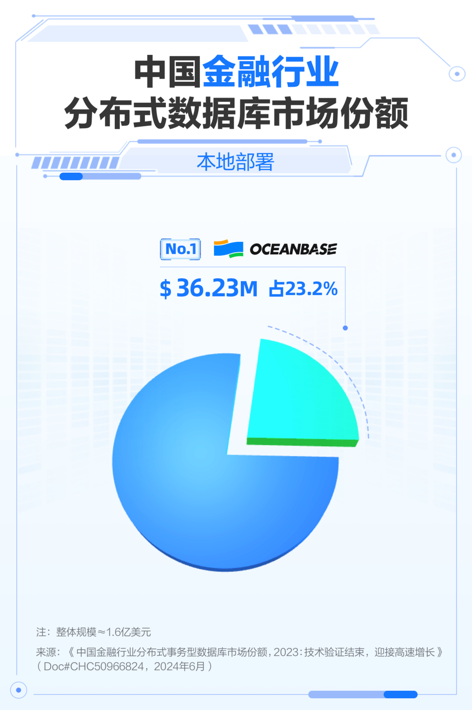 7 月 18 日,全球领先的 IT 市场研究和咨询公司 IDC 发布 《中国金融行业分布式事务型数据库市场份额,2023:技术验证结束,迎接高速增长》(Doc#CHC50966824,2024 年 6 月) 报告。OceanBase 占据两项第一:金融行业本地部署市场份额第一、保险证券子市场本地部署份额第一。
