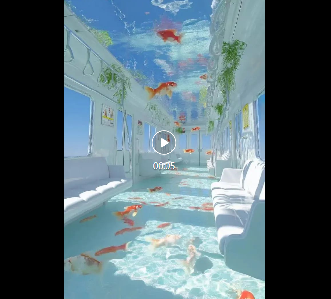 车厢内,金鱼悠然游动。阳光透过水面,闪烁着光芒。镜头缓缓移动,捕捉着这梦幻般的场景,光影交织,营造出一种迷人的氛围。