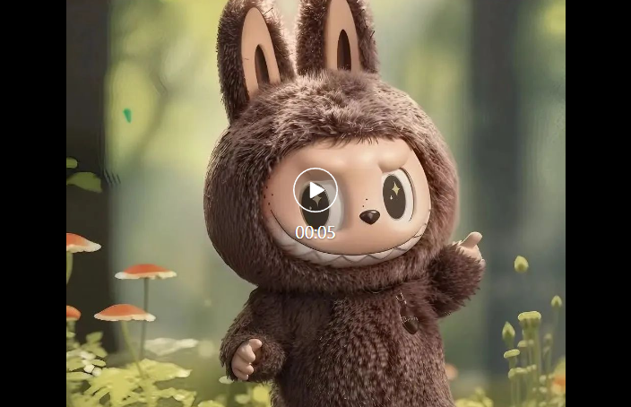 输入视频描述:森林里,阳光透过树叶洒落,镜头缓缓移动,labubu 旋转跳跃。