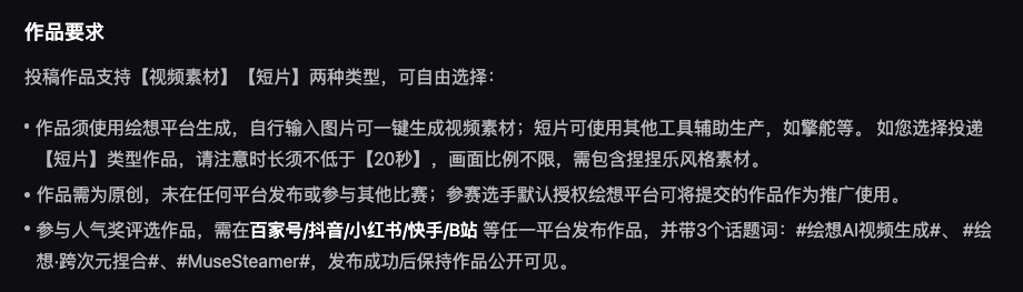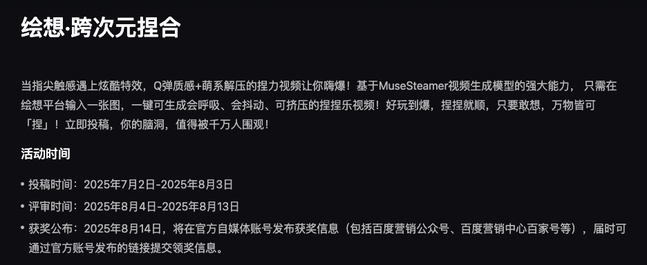 绘想平台还启动了 「跨次元捏合」AI 视频创作大赛,用户通过单图输入可生成动态捏捏乐视频进行参赛,还有万元大奖等你拿,小伙伴们不妨试试。