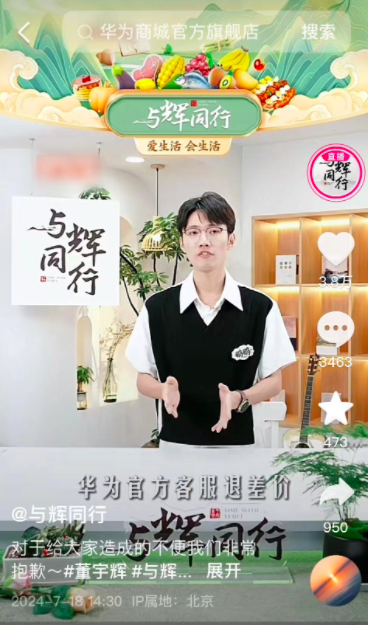 对此,与辉同行宣布 15 号在直播间购买了华为对应产品的网友,可以去找华为客服退差价,如果退差价过程中碰到问题,可以联系与辉同行客服。并对此事引起的不便,表达了歉意。