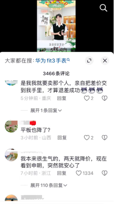 这一突然宣布的降价行为,让刚刚在与辉同行直播间买了华为产品的消费者非常难以接受。毕竟只买了 3 天的手机,突然降价好几百。