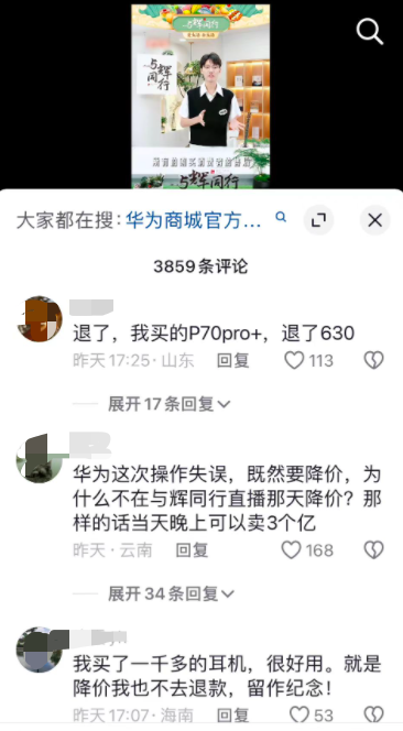 还有网友吐槽:「华为这次操作失误,既然要降价,为什么不在与辉同行直播那天降价? 那样的话当天晚上可以卖 3 个亿」。