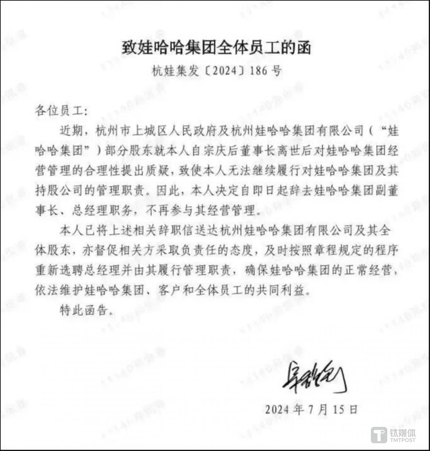 网传的辞职信表示,宗馥莉称,近期杭州市上城区人民政府及杭州娃哈哈集团有限公司 (「娃哈哈集团」) 部分股东就本人自宗庆后董事长离世后对娃哈哈集团经营管理的合理性提出质疑,致使本人无法继续履行对娃哈哈集团及其持股公司的管理职责。因此,本人决定自即日起辞去娃哈哈集团副董事长、总经理职务,不再参与其经营管理。