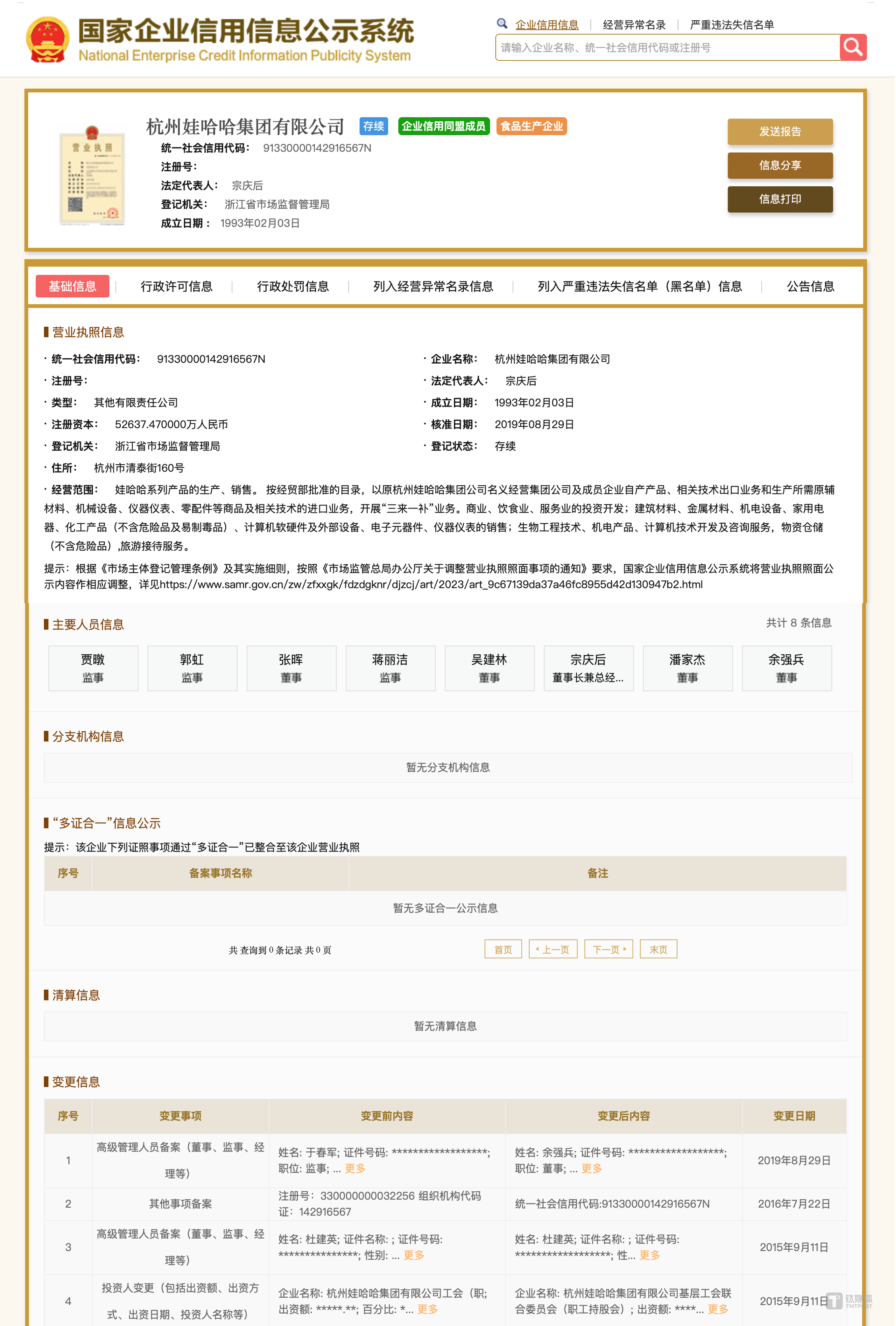 国家企业信用信息公示系统显示,娃哈哈集团成立于 1993 年 2 月,注册资金 52637.47 万元。股东包括宗庆后、杭州娃哈哈集团有限公司基层工会联合委员会 (职工持股会)、杭州上城区文旅投资控股集团有限公司。董事会成员包括宗庆后、张晖、吴建林、潘家杰,余强兵等 5 人,其中宗庆后为董事长和总经理。而变更信息中,有关高级管理人员的变更也未涉及到宗馥莉,最新一次的信息变更时间在 2019 年。