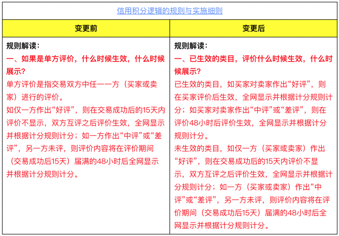 此次规范核心变更点为:删除卖家给予买家好评/差评的功能,买家评价后,卖家无需评价即可按照买家评价的情况积累信用积分;若买家未评价,则卖家信用积分默认加 1 分。