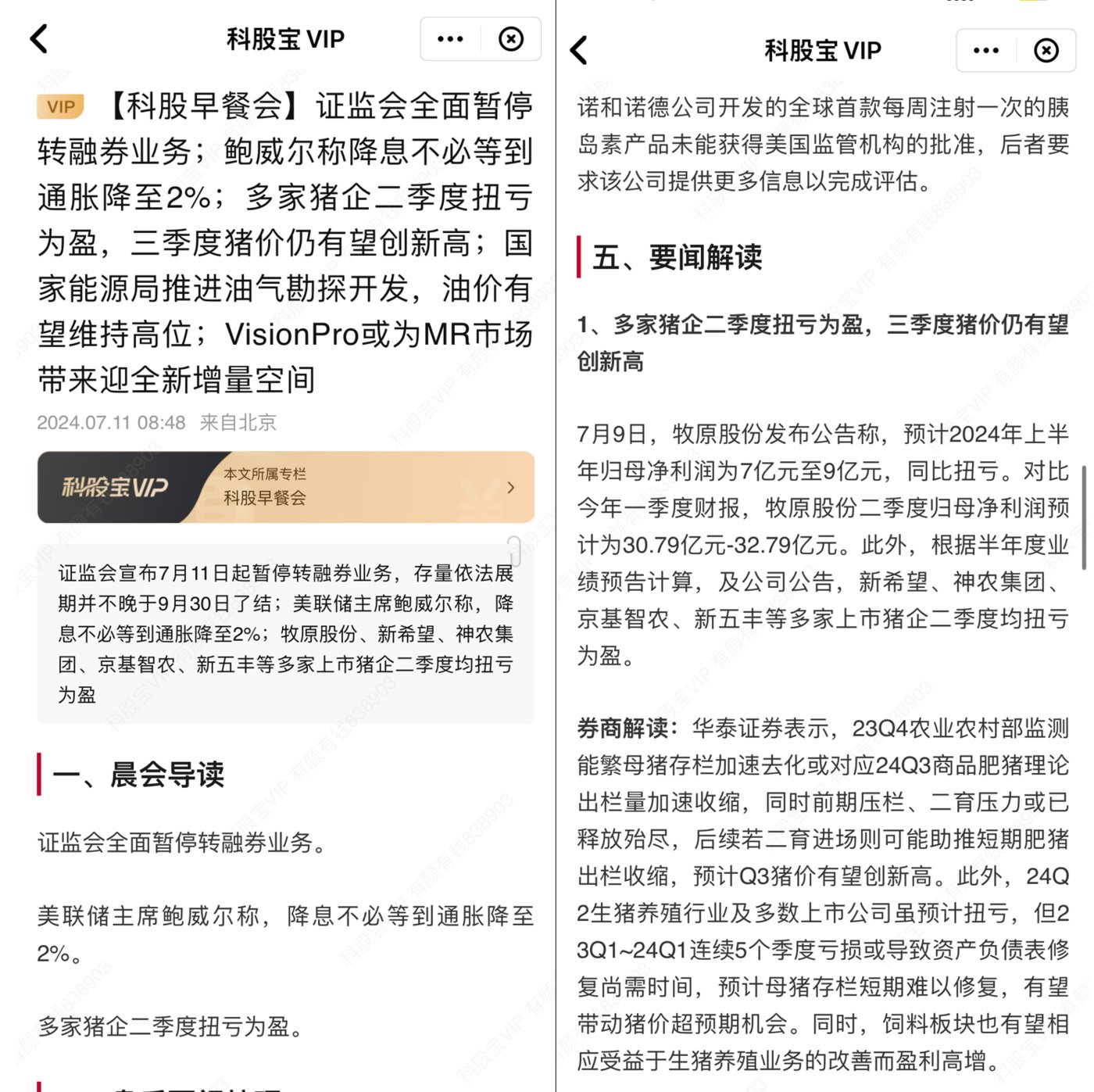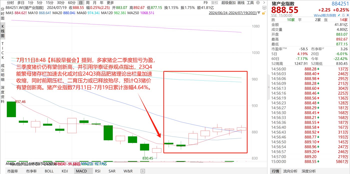 7 月 11 日 8:48【科股早餐会】 提到,多家猪企二季度扭亏为盈,三季度猪价仍有望创新高,并引用华泰证券观点指出,23Q4 能繁母猪存栏加速去化或对应 24Q3 商品肥猪理论出栏量加速收缩,同时前期压栏、二育压力或已释放殆尽,预计 Q3 猪价有望创新高,同时饲料板块也有望相应受益于生猪养殖业务的改善而盈利高增。
