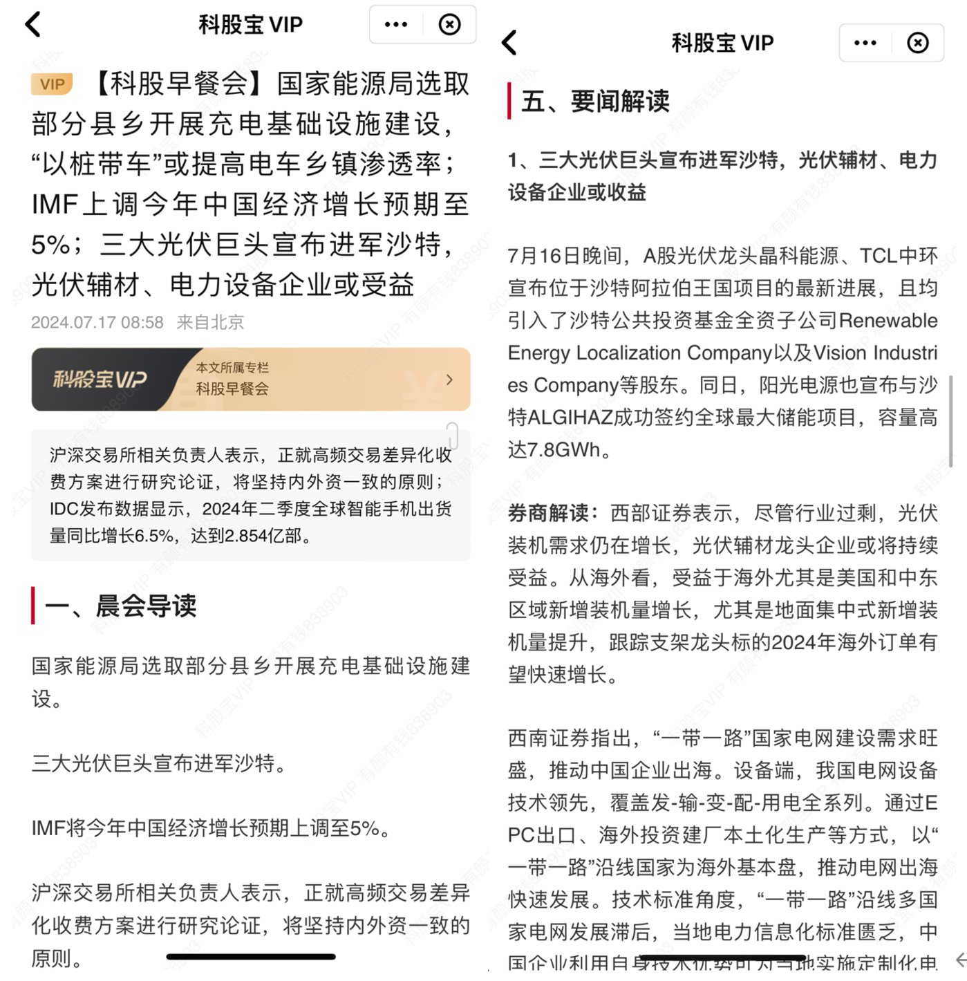 7 月 17 日 8:58【科股早餐会】 提到,三大光伏巨头宣布进军沙特,并引用西部证券观点表示,从海外看,受益于海外尤其是美国和中东区域新增装机量增长,尤其是地面集中式新增装机量提升,跟踪支架龙头标的 2024 年海外订单有望快速增长。