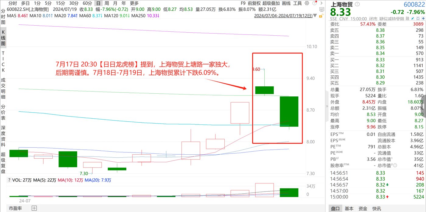 (2)7 月 17 日 20:30【日日龙虎榜】 提到,上海物贸上塘路一家独大,后期需谨慎。