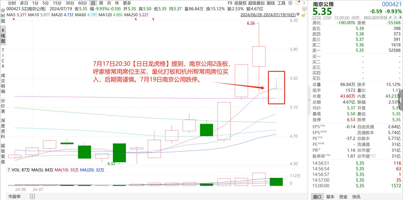 (3)7 月 17 日 20:30【日日龙虎榜】 提到,南京公用 2 连板,呼家楼常用席位主买,量化打板和杭州帮常用席位买入,后期需谨慎。