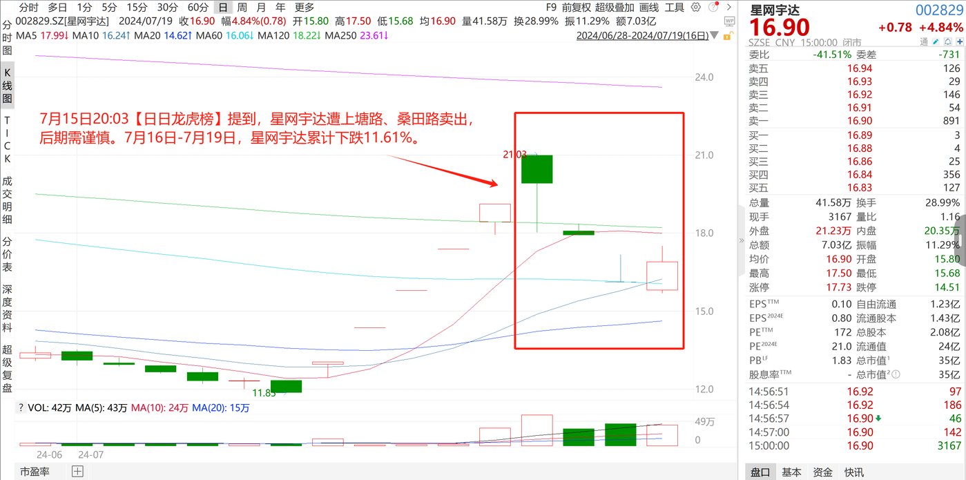 (1)7 月 15 日 20:03【日日龙虎榜】 提到,星网宇达遭上塘路、桑田路卖出,后期需谨慎。