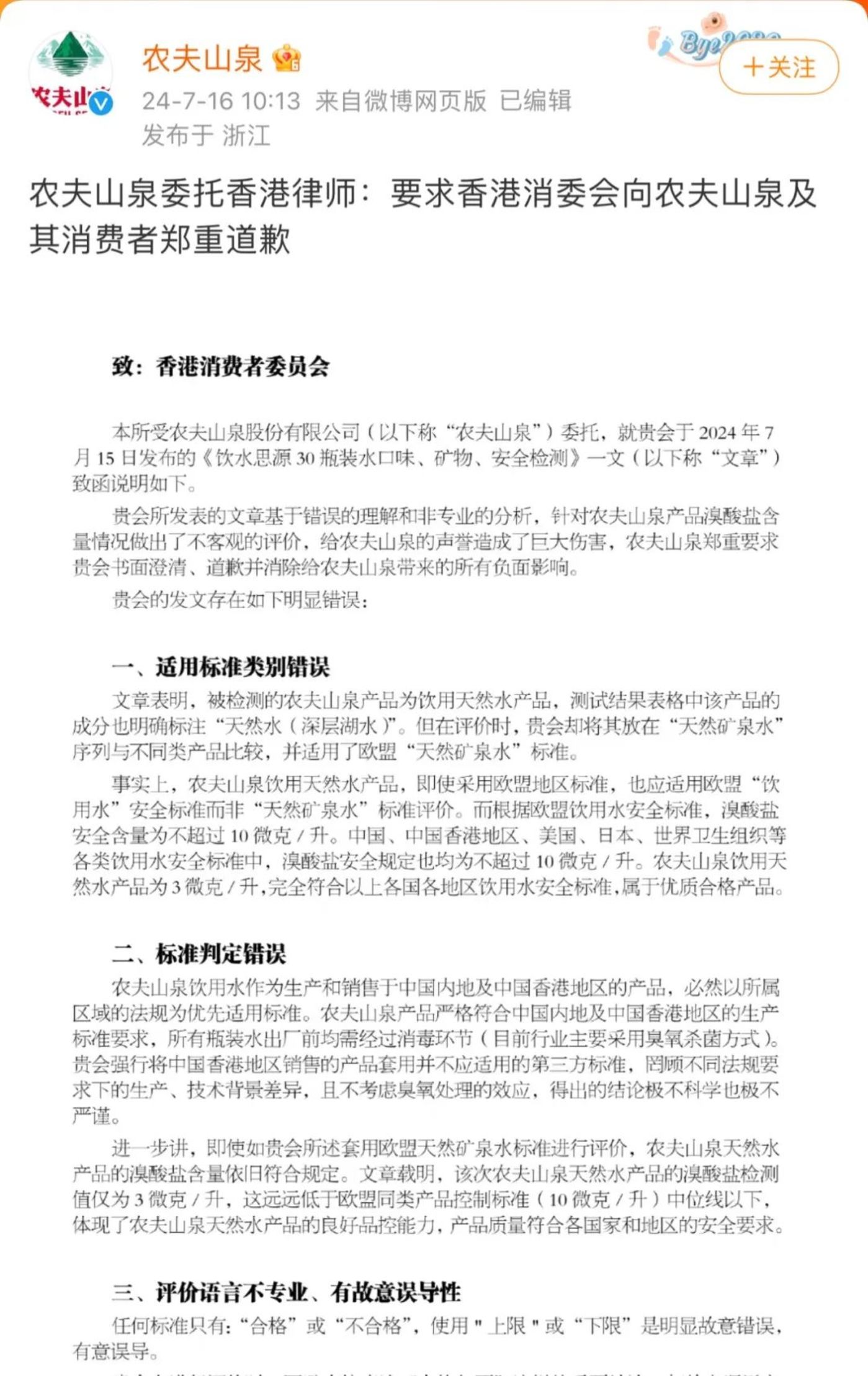 七月,农夫山泉又面临香港消委会 「溴酸盐」 的舆论质疑。面对莫须有的质疑,农夫山泉选择正面硬刚,列举了香港消委会文章的三大错误并要求香港消委会道歉。