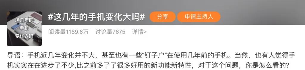 最近有一个热门的微博话题 「这几年手机的变化大吗」,网友的讨论都是,感觉新手机和四年前都没太大不同,这也是为什么现在 「手机钉子户」 越来越多。