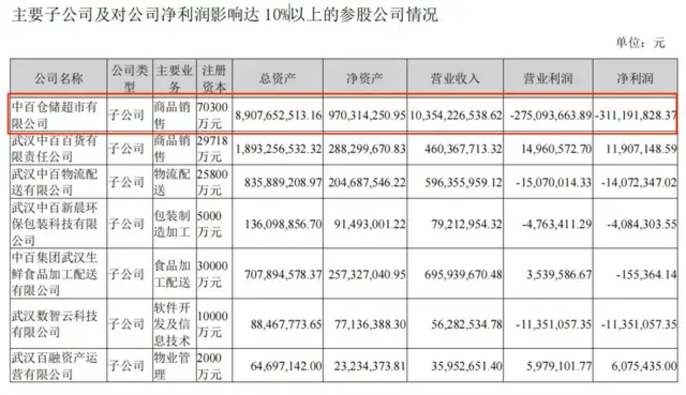 从最直观的业绩表现来看,2021-2023 年三年间,中百集团营收分别为 123.31 亿元、121.97 亿元、116.39 亿元;分别亏损 0.22 亿元、3.2 亿元与 3.38 亿元,连亏三年,而中百仓储营业利润和净利润在一众主要子公司中都呈最大亏损状态。