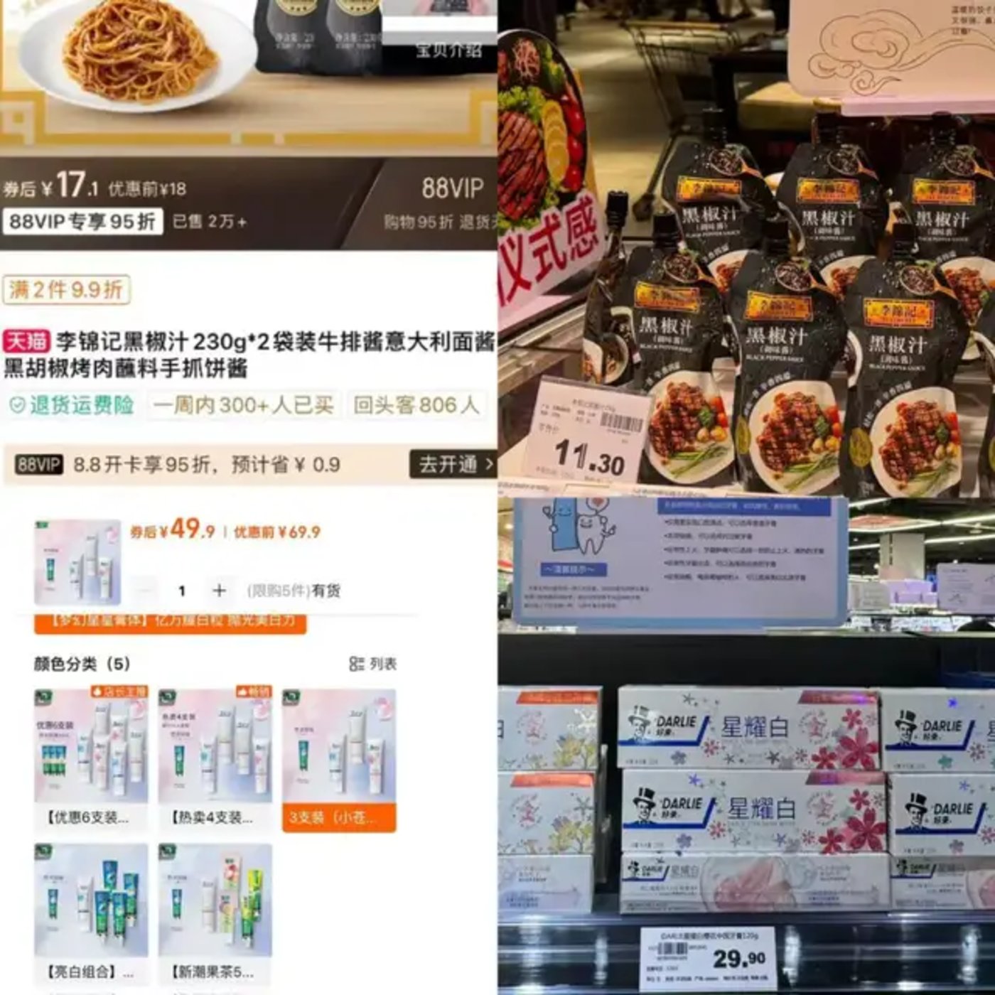 如李锦记黑椒汁,中百仓储售价为 11.3 元,而天猫旗舰店,同克重的两包仅售价 17.1 元 (每包 8.55 元);DARLIE 星耀白樱花中国牙膏中百仓储售价 29.90/支,线上旗舰店售价 49.9/三支 (每支 16.6 元)。