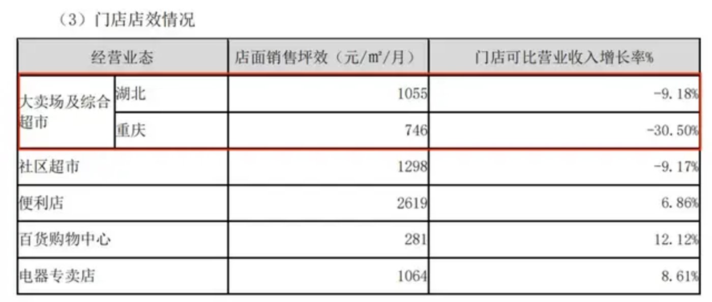 据 2023 年中百集团年报,大卖场及综合超市门店可比营业收入增长率在湖北和重庆两地均呈下降状态 (其中湖北地区增长率为-9.18%;重庆地区增长率为-30.50%)。