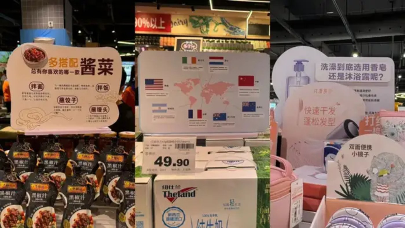 也因此,商场两层楼都有服务者举立牌指明方向和排队引导,在商场内随处可见各种 「胖东来同款」 立牌,包括对商品的介绍、温馨提示、科普知识等。