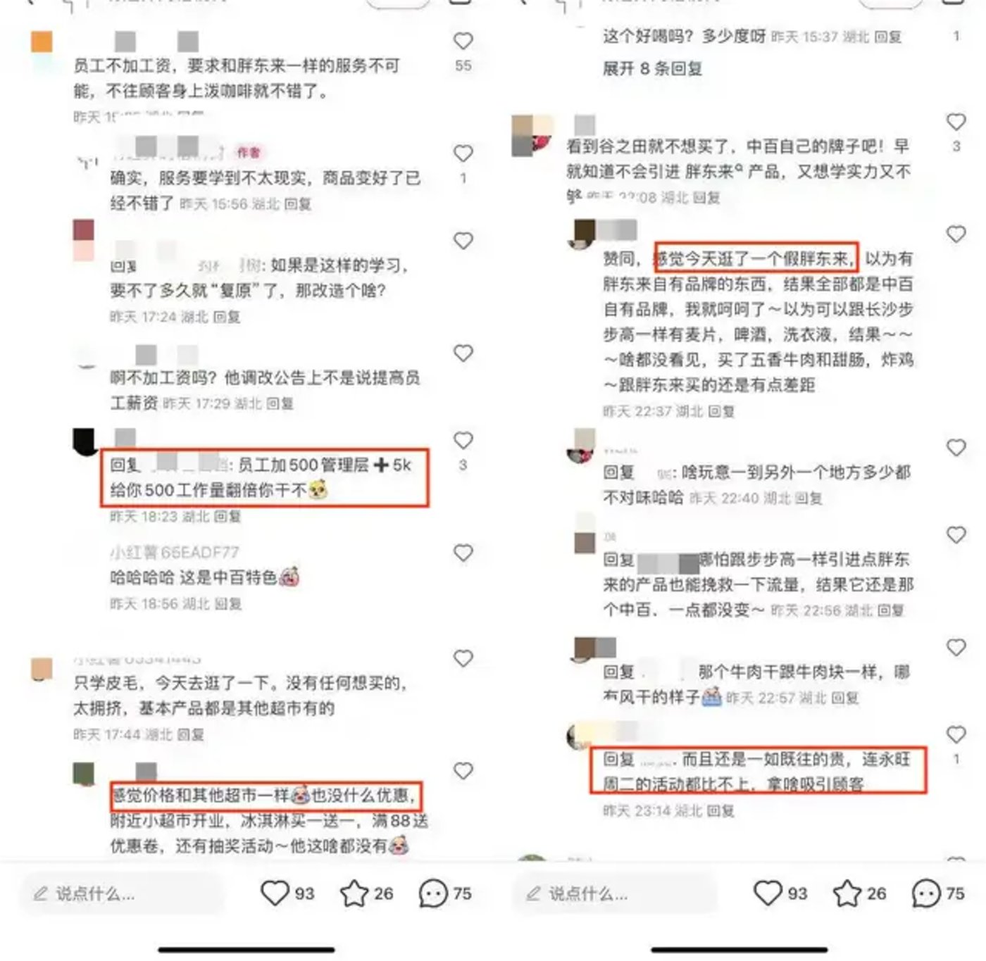 有消费者认为,给员工加的薪资与增长的工作量不匹配、价格对比其他商超无竞争力、没有胖东来自有商品等。