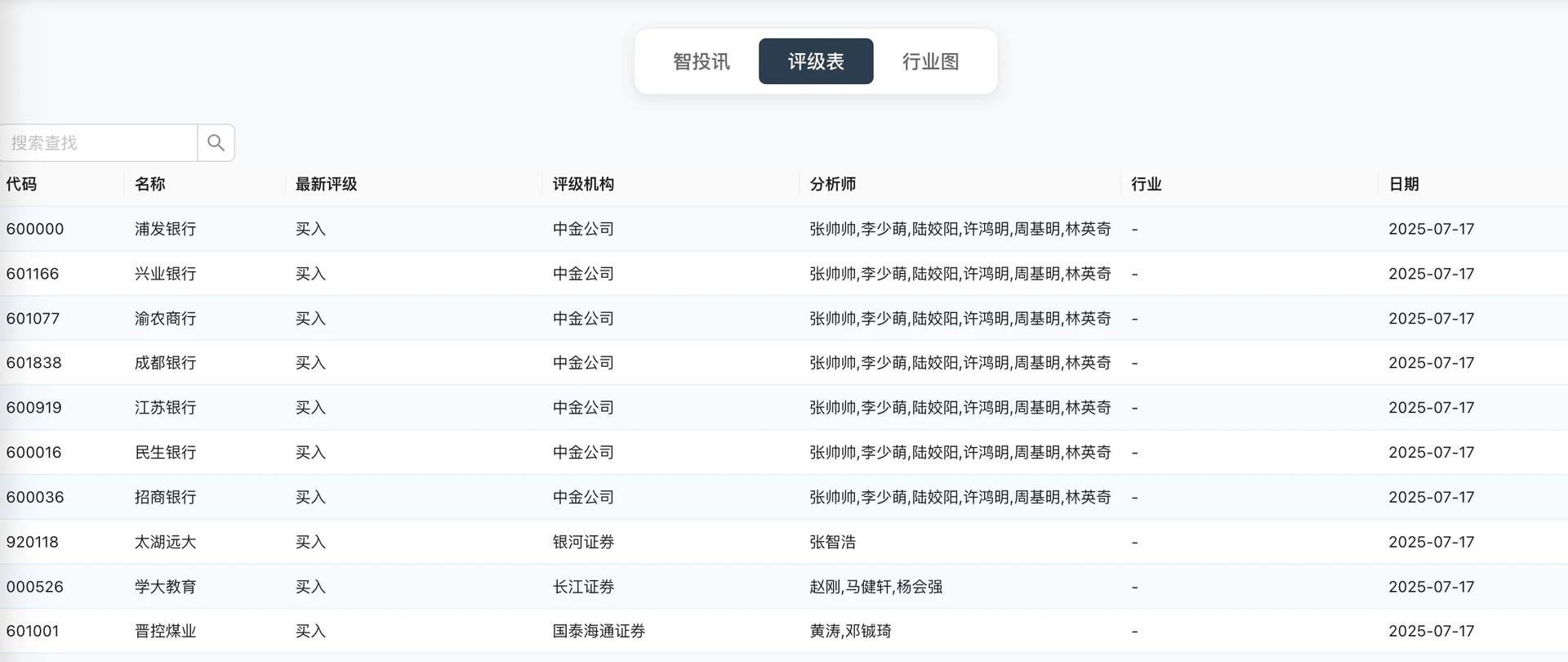 智投讯云图将三大核心功能模块——智投讯、评级表、行业图,整合在一个统一的页面中。通过顶部的选项卡切换,用户可以快速浏览不同维度的市场信息,提升效率,避免跳转干扰。