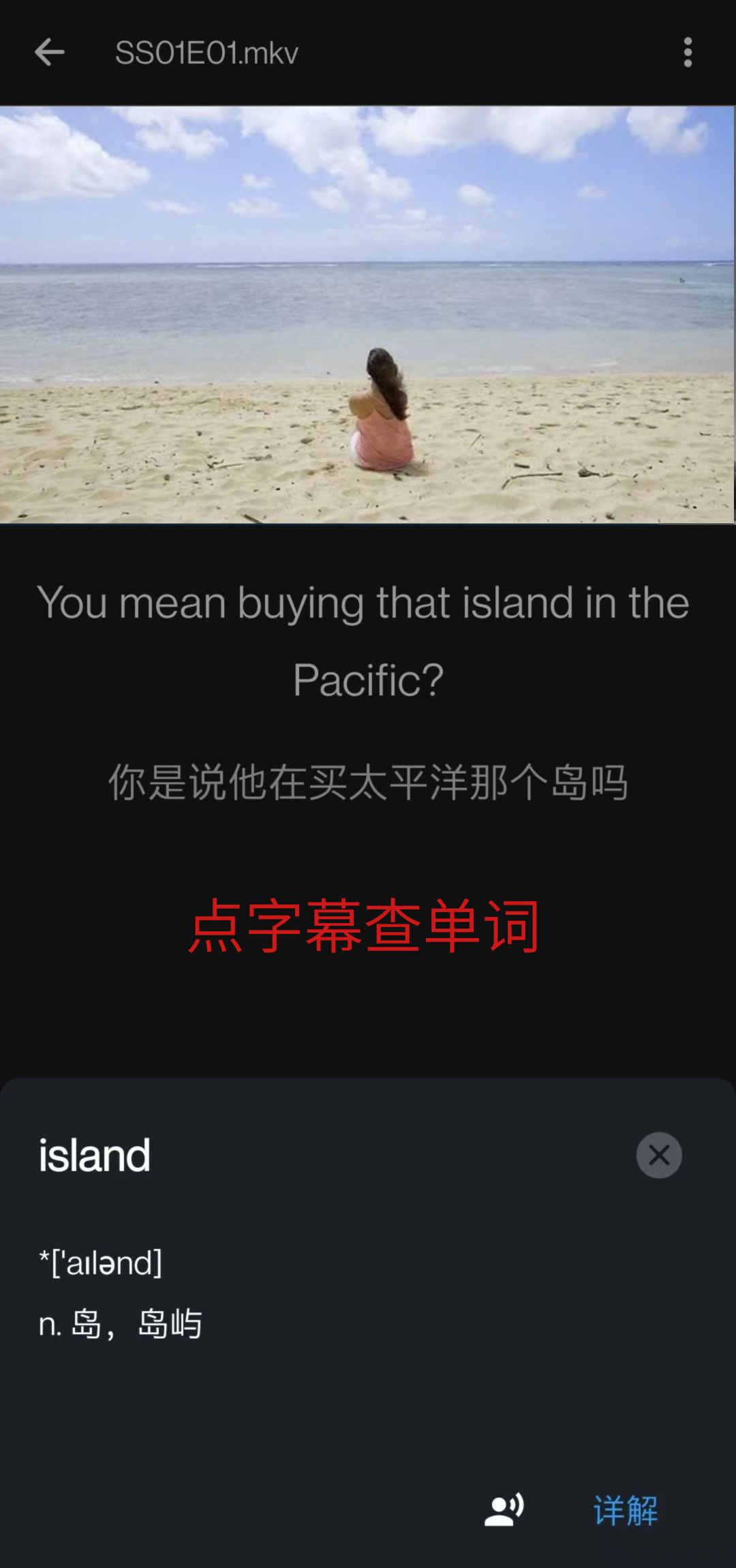 点字幕中的单词可以直接查词典。
