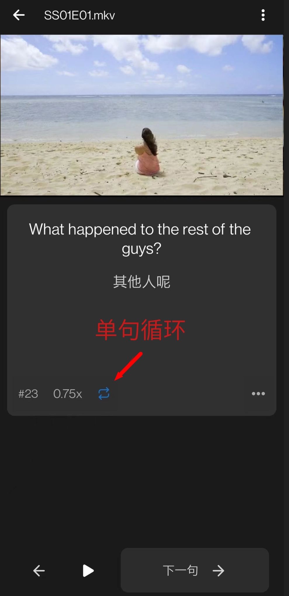 英语不够熟练的朋友可以开启单句循环,重复播放一个句子,听懂了再点下一句,简单句快速跳过,难句重复听,效果事半功倍