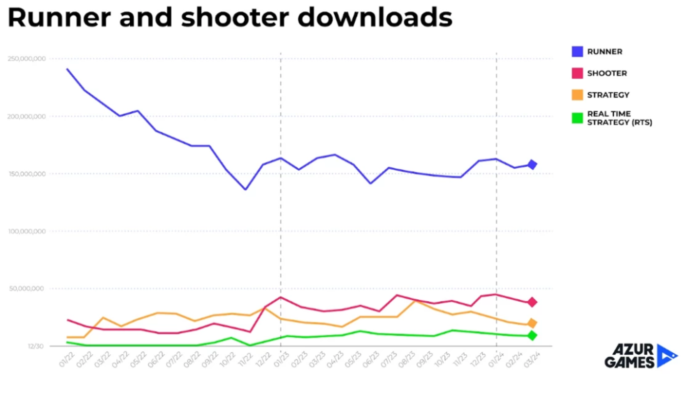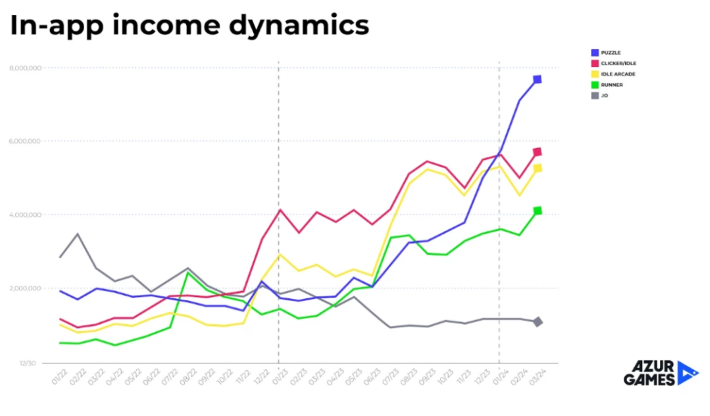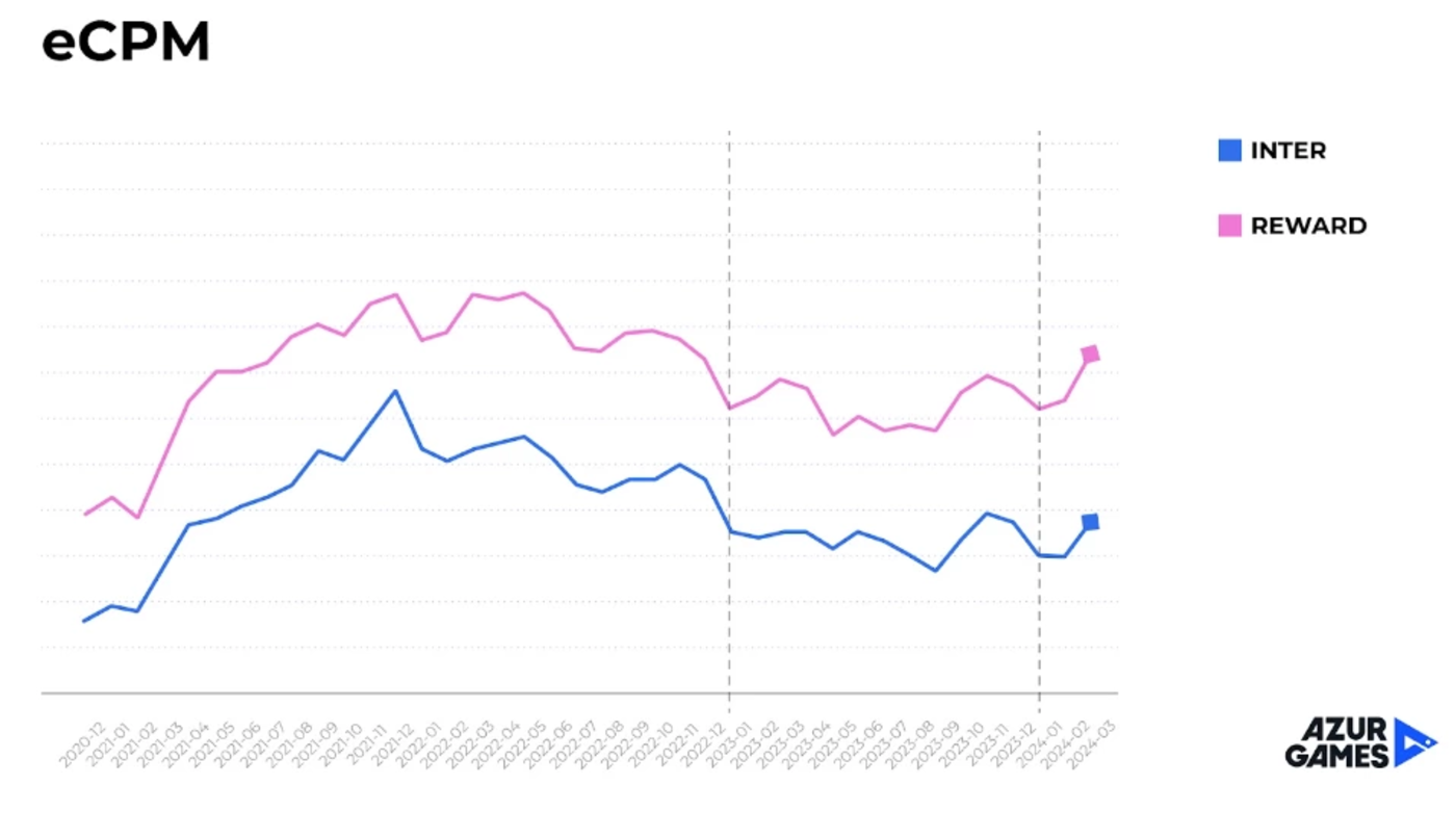 eCPM 的情况也是类似,去年出现了明显的下滑。这是 Azur Games 内部的数据,虽然没有具体的数字指标,但展示了许多大型发行商大致的处境。eCPM 是市场健康度的一个指标,因此它在 2024 年开头出现的增长令人鼓舞。