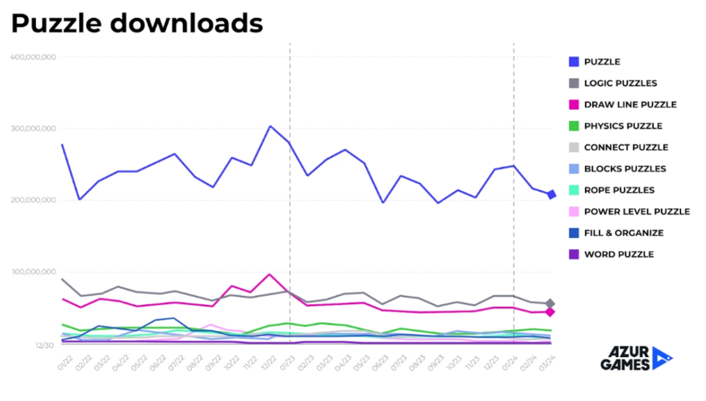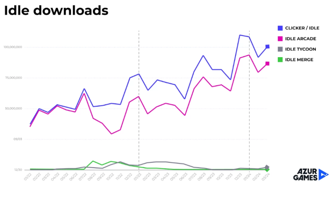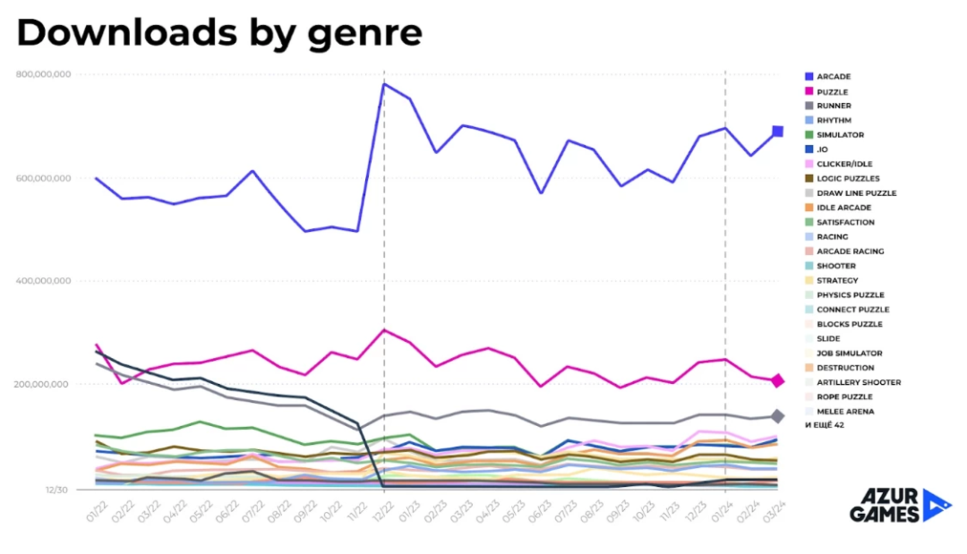 eCPM 的情况也是类似,去年出现了明显的下滑。这是 Azur Games 内部的数据,虽然没有具体的数字指标,但展示了许多大型发行商大致的处境。eCPM 是市场健康度的一个指标,因此它在 2024 年开头出现的增长令人鼓舞。