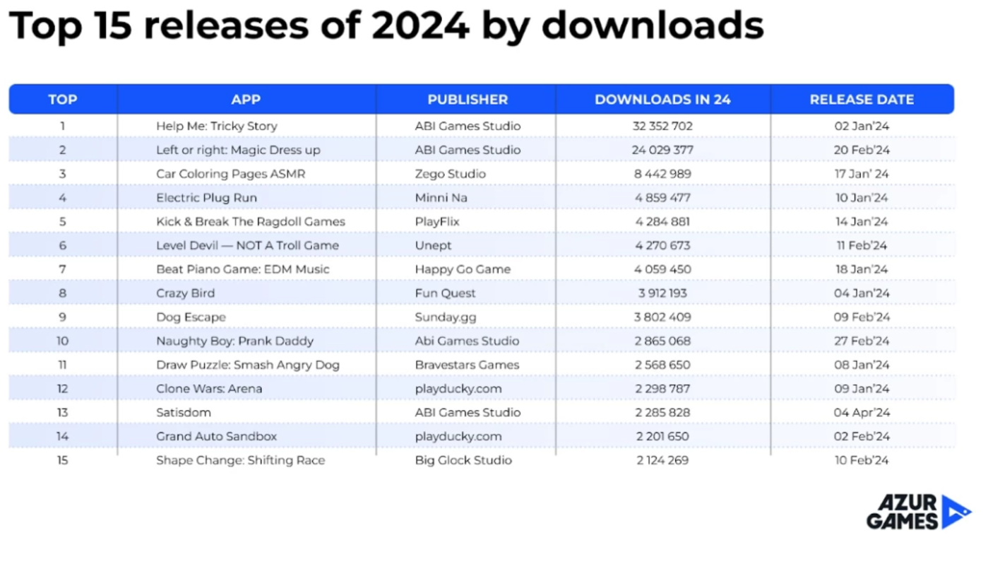 在 2024 年发布的超休闲游戏中,下载量最高的是两款游戏 《Help Me: Tricky Story》 和 《Left or right: Magic Dress up》 都是来自 ABI Games Studio,下载量均达到了千万级别。