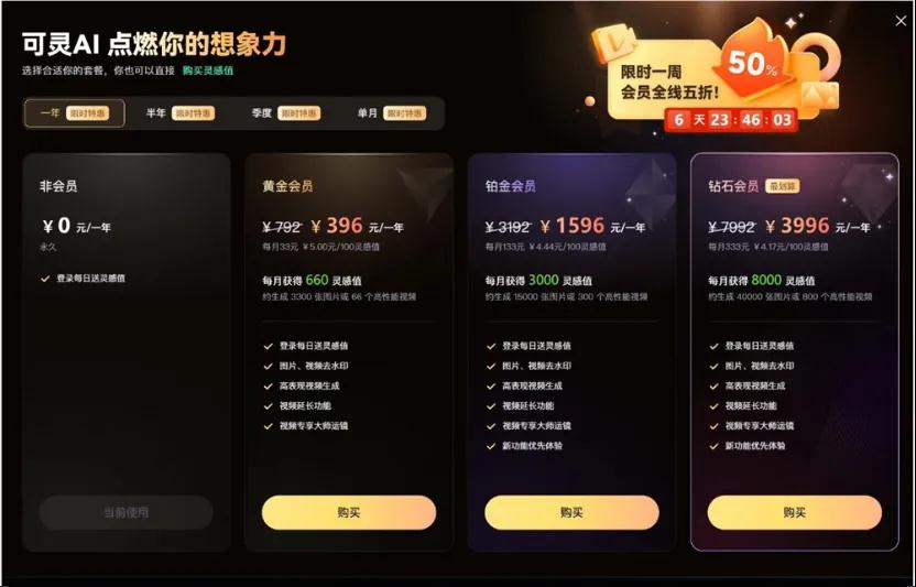 用户规模是产品商业化的土壤,基于此,外界对于可灵商业化的想象空间也被进一步打开。目前,可灵 AI 已经上线了付费会员体系,分为黄金、铂金、钻石三个级别,月卡价格分别为 66 元、266 元和 666 元,对应生成约 66 个、300 个或 800 个标准视频。