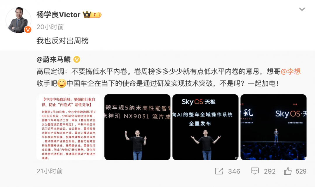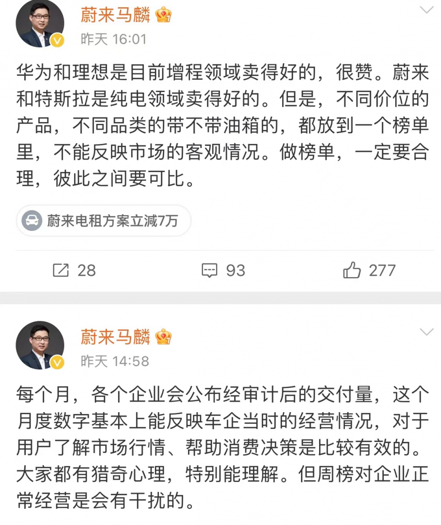 榜单发布两小时后,蔚来品牌与传播助理副总裁马麟在个人微博发文称,「高层定调:不要搞低水平内卷。卷周榜多多少少就有点低水平内卷的意思,想哥收手吧,中国车企在当下的使命是通过研发实现技术突破,不是吗?一起加电! 」 并 @李想。