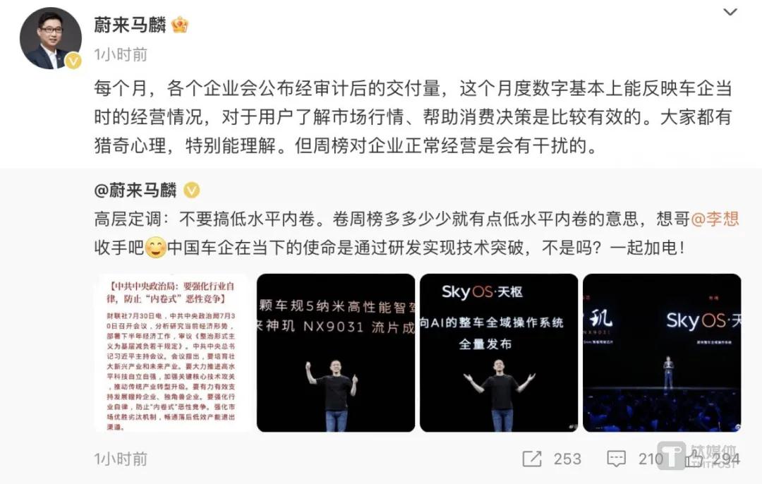 在理想发布最新周榜后不久,蔚来汽车公关总监马麟在微博上专门 @李想本人表示,卷周榜多多少少就有点低水平内卷的意思,想哥 @李想收手吧。中国车企当下的使命是通过研发实现技术突破。并发出反问:「不是吗?」